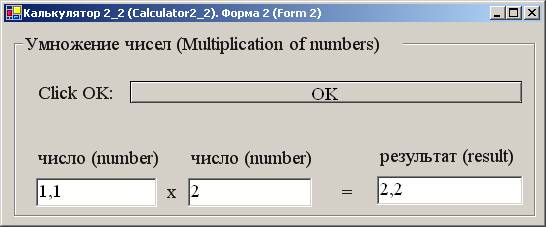 Алгоритм этого примера сформулируем так: на первой (главной) форме: в первое окно вводим первый сомножитель; во второе окно вводим второй сомножитель; щёлкаем по кнопке со знаком равенства; на появившейся второй форме (с пустыми тремя окнами) щёлкаем кнопку OK, после чего во всех трёх окнах мы увидим числа. Проверяем (контролируем) правильность вывода программой двух сомножителей в первые два окна второй формы (эти значения мы просто передадим с первой формы и подробно объясним, как это делается); анализируем результат умножения, который мы увидим в третьем окне.