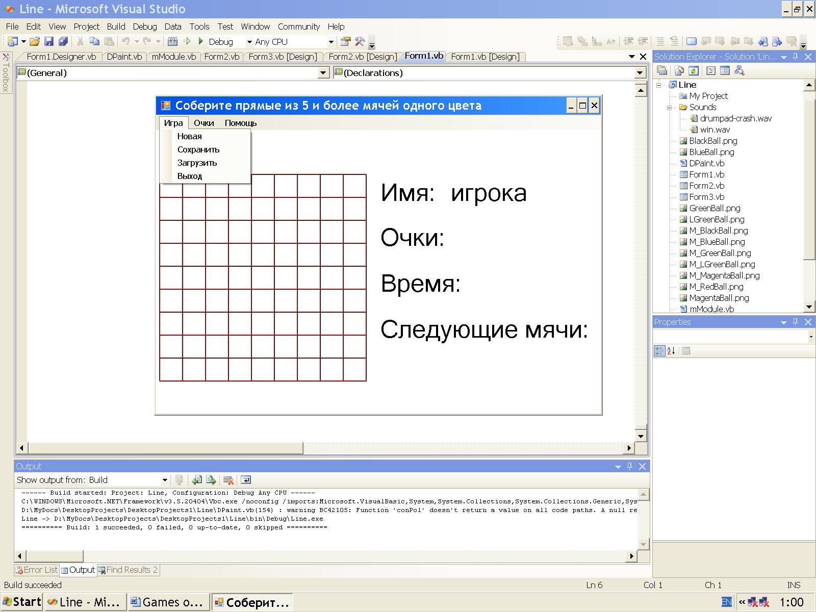 Данную игру мы будем разрабатывать, следуя игре Line (проект lines_vbnet.zip в заархивированном виде) из Интернета, которая разработана на устаревшей версии Visual Studio. Поэтому автор данной книги разработал эту игру на современной версии Visual Studio, исправил ошибки и дополнил её недостающими для типичной игры элементами, например, счётчиком секунд и мелодиями начала и окончания времени игры.