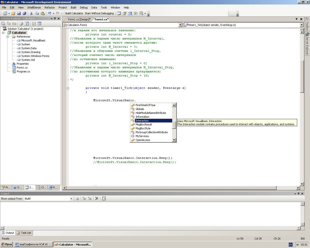Когда далее после имен Microsoft.VisualBasic мы запишем тот же оператор (.), то увидим подсказку из списка классов пространства имён VisualBasic, которые мы можем применить в данном приложении (рис. 2.15). Отметим, что если бы ранее мы не создали ссылку на динамически подключаемую библиотеку (dynamic link library) Microsoft.VisualBasic, то сейчас мы бы не увидели этого списка классов. Дважды щёлкаем по имени класса Interaction, тем самым вставляя это имя в код: