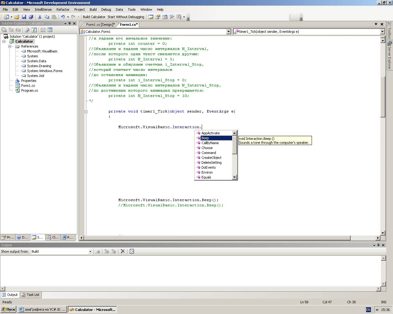 Когда далее после имен Microsoft.VisualBasic.Interaction мы запишем оператор (.), то увидим подсказку в виде списка методов (процедур и функций) Visual Basic из класса Interaction, которые мы можем применить в данном приложении (рис. 2.16). Дважды щёлкаем по имени функции Beep(), тем самым вставляя это имя в код (Microsoft.VisualBasic.Interaction.Beep()).
