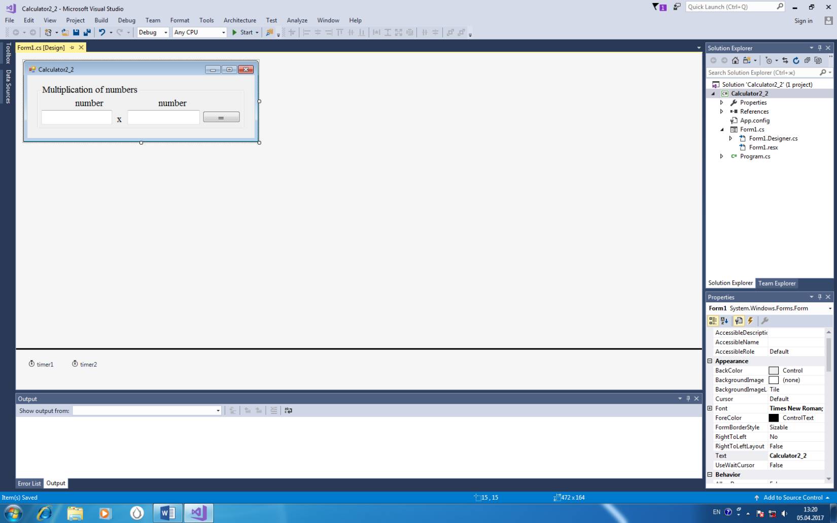 Будем усложнять методические примеры. Поэтому, если в предыдущей главе мы разработали методику ввода исходных данных в одну форму и вывода результатов расчёта на эту же форму, то в этой главе рассмотрим пример (который может найти широкое применение на практике) и разработаем методику ввода исходных данных в одну форму, а вывода результатов проектирования на другую форму. Эта же методика может быть применена и при создании вычислительной системы для вывода результатов проектирования на большое число форм в соответствии с потребностями пользователя. Так как на практике (например, на производстве) важным является решение различных расчётных задач, то продолжим разработку методического примера расчёта, например, умножения двух чисел. Алгоритм этого примера сформулируем так: