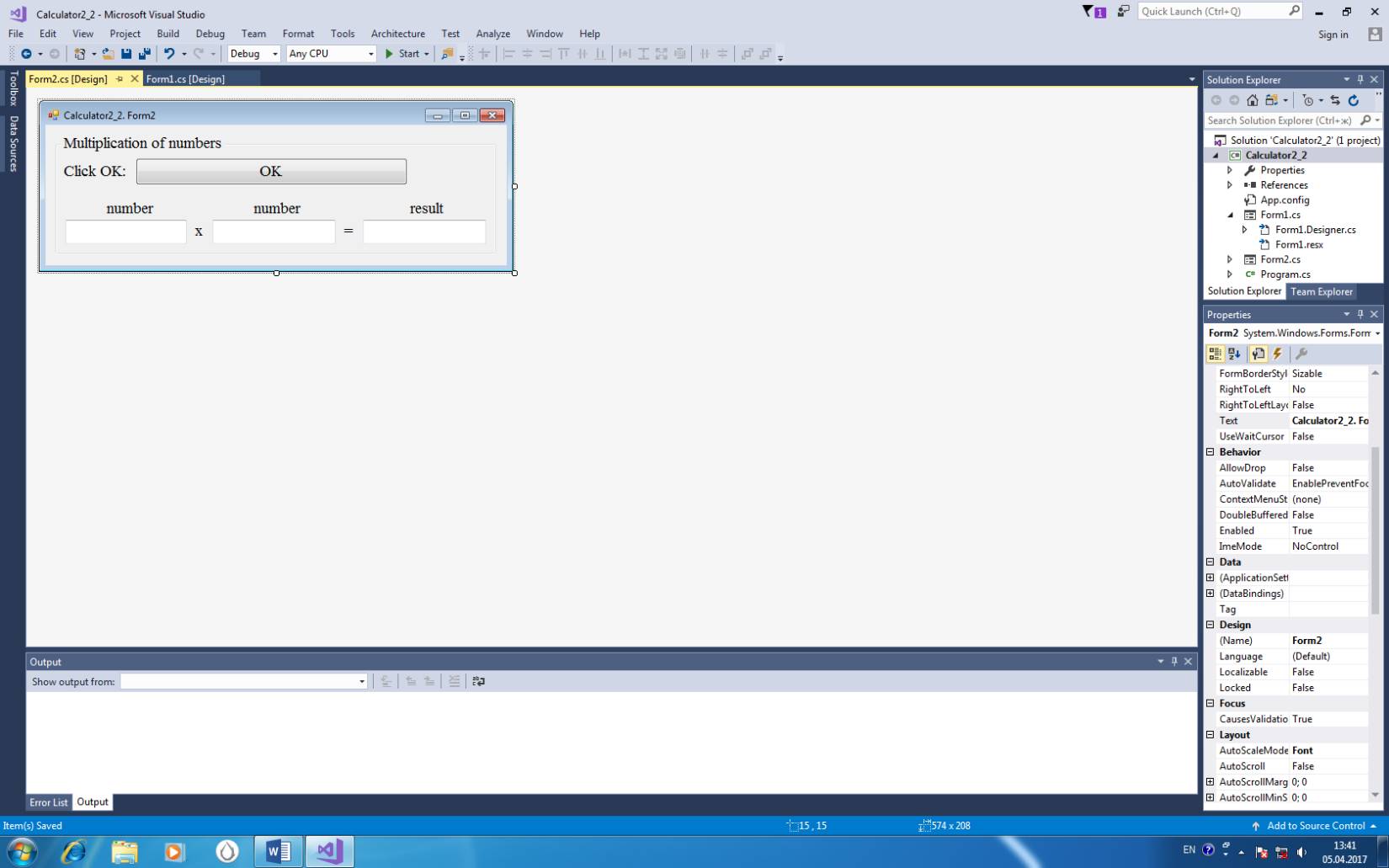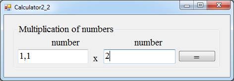 После окончания расчётов щёлкаем значок “x” (Close). В ответ Visual C# закрывает вторую форму, но оставляет открытой первую форму. Мы можем ввести другие значения в окна первой формы и аналогично получить результат умножения других чисел.