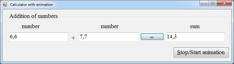 Для проверки этого кода по первому варианту (листинг 2.3) запускаем программу, например, так: Ctrl+F5. В ответ Visual C# выполняет программу и на рабочий стол выводит форму в режиме выполнения. На этой форме с заданной нами частотой в 500 миллисекунд (или 0,5 секунды) заголовок “Калькулятор (Calculator)” сменяется на “Калькулятор с анимацией (Calculator with animation)” (рис. 2.11), и таким образом создаётся эффект анимации.
