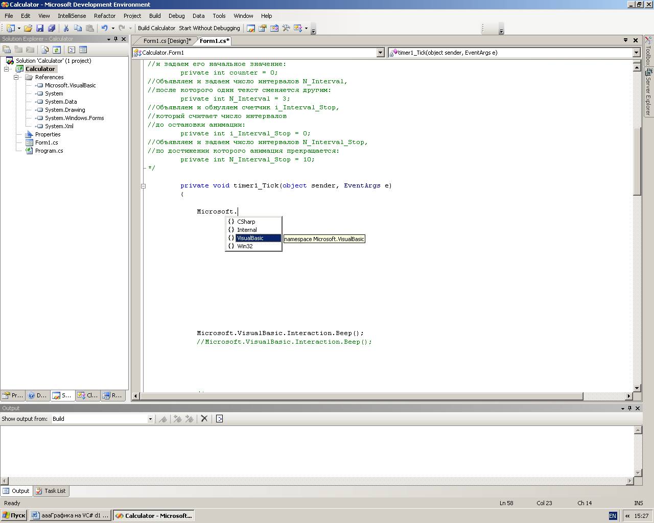 Согласно приведённой в предыдущем параграфе методике использования в нашем приложении метода (функции) из любого другого комплекса, создаём ссылку на Visual Basic. Когда в шаблон функции для обработки, например, события Tick таймера в Visual C# мы запишем (после пространства имён Microsoft) оператор в виде точки (.), то увидим подсказку из списка пространств имён, которые мы можем применить в данном приложении (рис. 2.14).