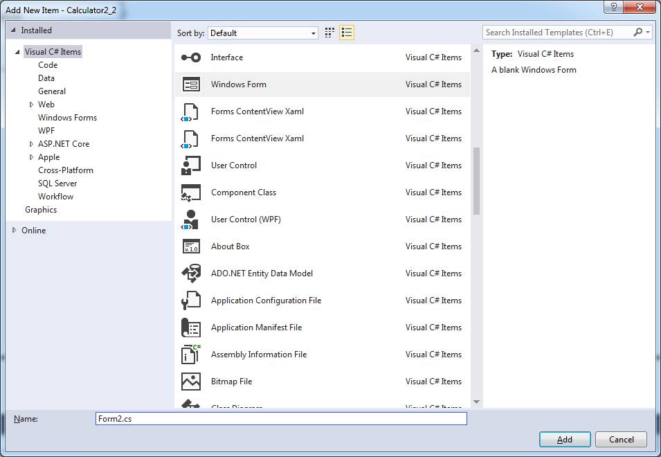 Для ввода в проект новой формы в меню Project выбираем Add Windows Form (или в панели Solution Explorer делаем правый щелчок по имени проекта и выбираем Add, Add Windows Form). Мы увидим панель Add New Item (рис. 3.2).