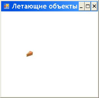 В ответ Visual C# выводит форму Form1 в режиме выполнения, на которой изображение типа встроенного нами рисунка сыра cheese.jpg перемещается из верхнего левого угла по диагонали сверху вниз (в нижний правый угол) и скрывается (рис. 4.3).