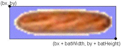 Ширина полей между объектом и описанным вокруг объекта прямоугольником должна быть сведена к минимуму, чтобы объект обязательно касался прямоугольника в как можно большем количестве точек и отрезков линий. Если начало прямоугольной системы координат “x, y” находится в верхнем левом углу экрана , то координаты верхней левой точки (bx, by) и нижней правой точки (bx + batWidth, by + batHeight) однозначно определяют данный прямоугольник на экране.