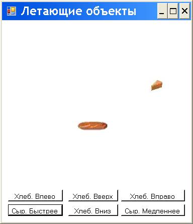 В режиме выполнения (Build, Build Selection; Debug, Start Without Debugging) при помощи кнопок Button и мыши мы можем перемещать хлеб и этим хлебом, как ракеткой, отбивать сыр вверх не только верхней стороной прямоугольника (описанного вокруг объекта), как было в предыдущем коде, но теперь и боковыми сторонами этого прямоугольника. Однако мы можем отбивать, только если сыр перемещается сверху вниз.