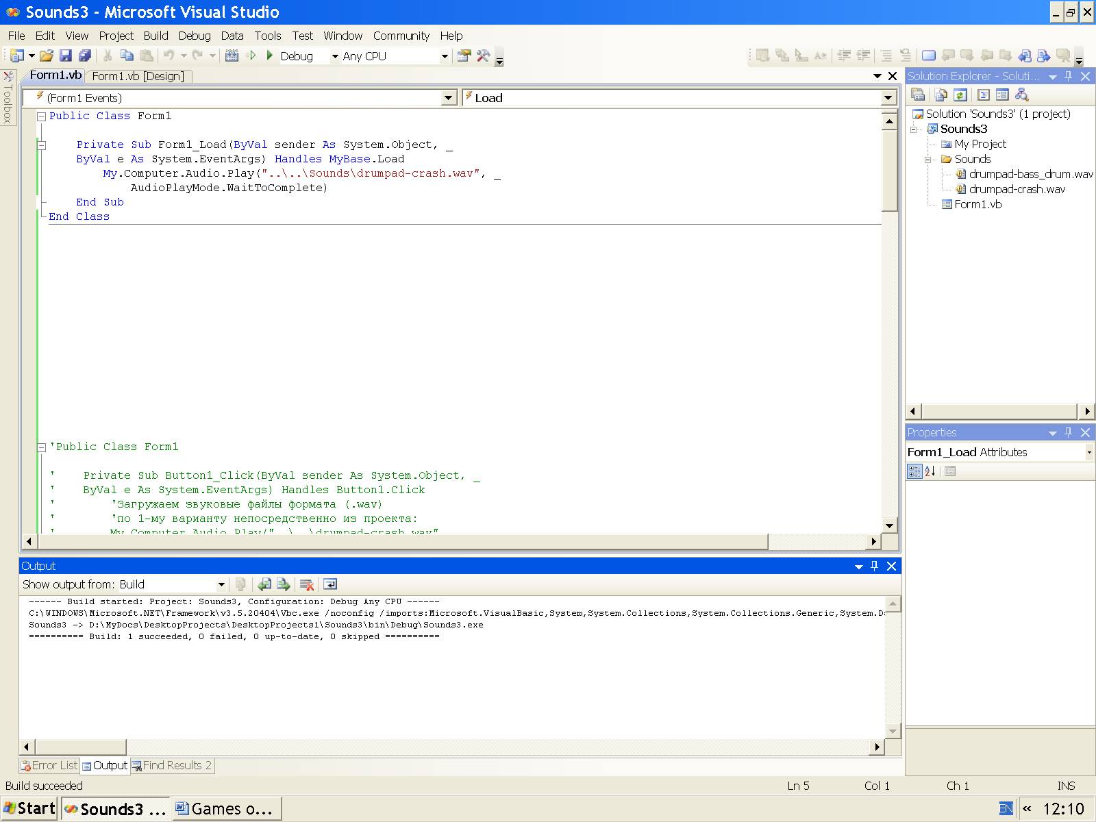В режиме выполнения (Build, Build Selection; Debug, Start Without Debugging) мы услышим соответствующее (одноразовое) воспроизведение звукового файла, который мы добавили непосредственно в проект (а не в дополнительную папку Sounds проекта).