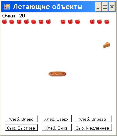Управляя при помощи кнопок Button и мыши перемещением батона хлеба, мы можем отражать сыр вверх таким образом, чтобы уничтожить как можно больше помидоров за меньшее время, набирая при этом очки.