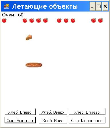 В режиме выполнения (Build, Build Selection; Debug, Start Without Debugging) несколько i-х помидоров появляются в верхней части экрана в качестве мишеней (рис. 5.7), которые исчезают после попадания в них летающего сыра (рис. 5.8).