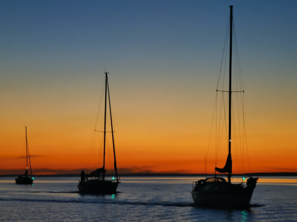 Сказано – сделано. Пока всё готовил, день почти пролетел и только в 17.40 я вышел из гавани, дав прощальный гудок туманным рожком. Когда вышел за пределы порта, проверил связь. Пока всё работало нормально. Поднял паруса и большую часть пути шёл на фордаке. Прекрасная получилась прогулка под парусами. А какой был шикарный закат!!! К заходу заштилело и пришлось запустить мотор. В 22.50 уже швартовался у пограничного причала острова Сантио. Здесь в последний раз опорожнил фекальный танк, благо насос на причале имелся. Дома такой роскоши не будет.