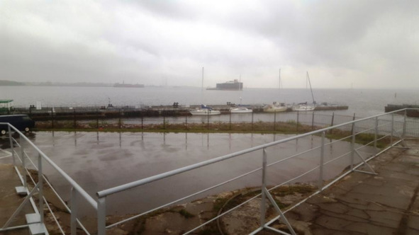 Вход в малюсенькую таможенную гавань никак не был обозначен буями, а рядом гранитные валуны дамбы. Причалы представляют собой удручающее зрелище. Старые раздолбанные железобетонные плавпричалы не оборудованы элементарными швартовными устройствами. Спасибо хоть покрышки вместо кранцев на них висят.
