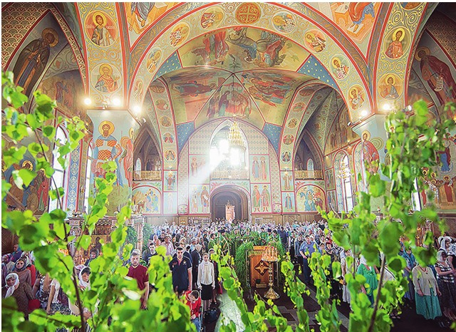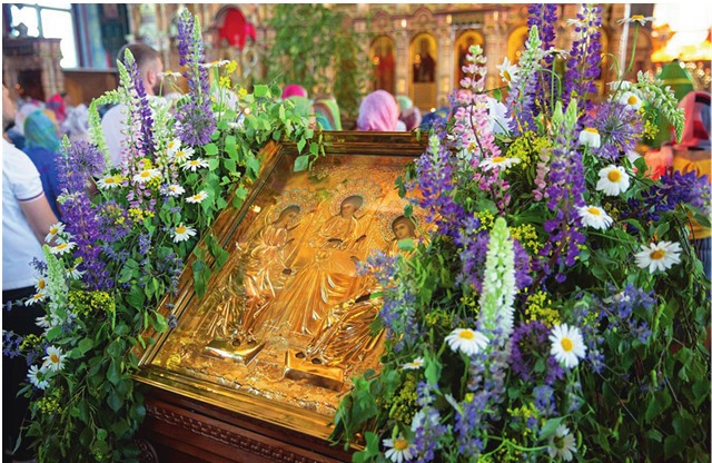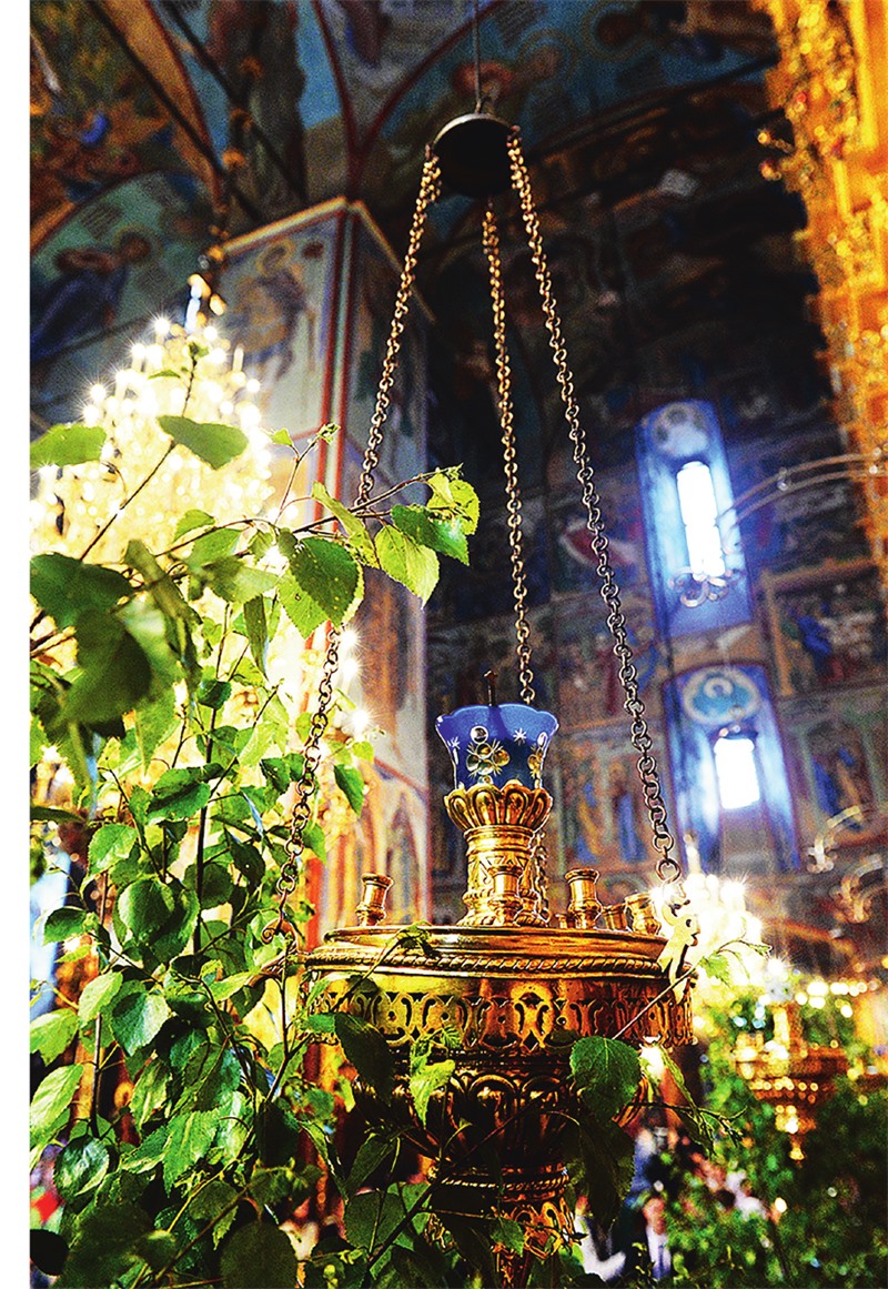 А перед праздником Святой Троицы в высоком храме стоит густой и сладкий дух, как над скошенным лугом. Подсыхают охапки травы, разбросанные по полу вместе со срезанными в ней колокольчиками, клевером и медуницей. Две большие березы склоняются над царскими вратами, другие, пониже, осеняют южный и северный алтарные входы, проемы окон. Ветки лиловой и белой сирени, подсвеченные красными пионами, как множеством лампад, стоят под иконами, у амвона. Деревья, цветы и травы вошли в храм, чтобы в нем получить освящение.