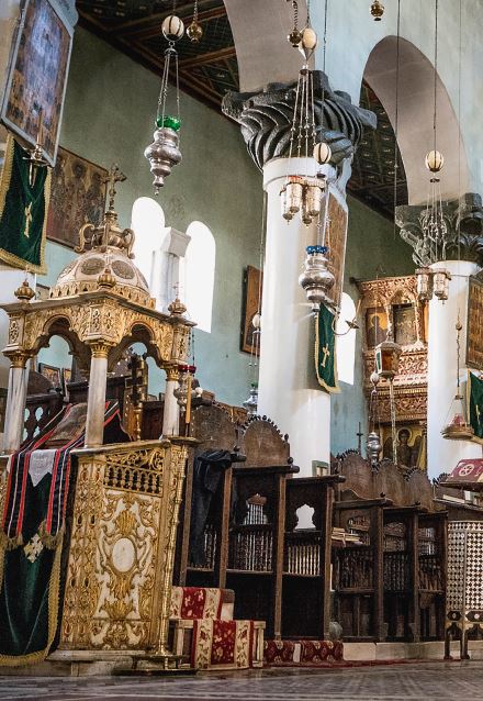 Справа у колонн возвышается трон архиепископа Синая, с великолепной резьбой по ореховому дереву и коленопреклоненными ангелами, поднимающими балдахин с куполком. Орел с раскрытыми крыльями поддерживает аналой, инкрустированный в восточном стиле…