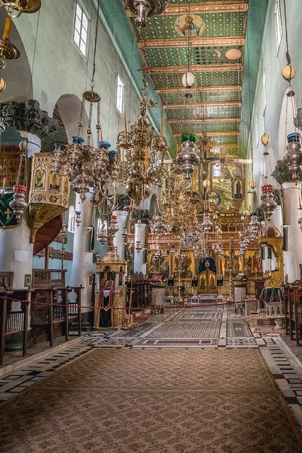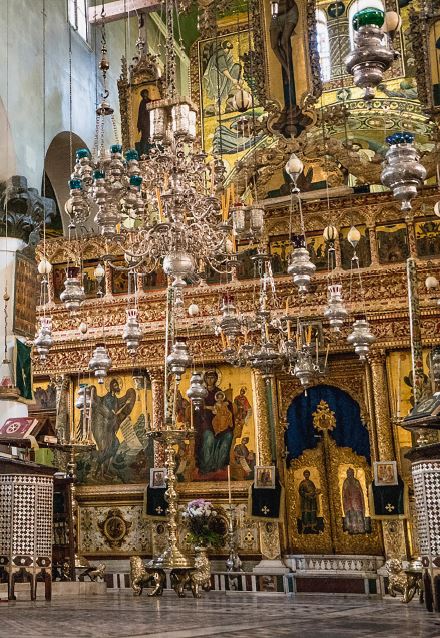 Под фронтоном золотисто-коричневая плоскость стены оживляется двумя арочными окнами, разделенными столбиком с капителью. И крест, и деревца с райскими плодами, проросшими под его сенью, и свободные размеры шероховатых камней – все напоминает архитектуру так любимых мною древних грузинских храмов со строгостью внешнего убранства и сокровенной внутренней красотой. В этой праздничной простоте запечатлелись ясность и сила веры раннего христианства. Монах раскрыл дверь, деревянную, тяжелую, с резьбой в форме крестов, столь же древнюю, как стены, и я вступила в высокое пространство, подсвеченное разноцветными огоньками. Огромные узорные паникадила и множество серебряных, медных и хрустальных лампад спускаются с потолка на цепях – прежние паломники насчитывали их более пятидесяти. Позолоченные шары в середине каждого паникадила и с размахом вынесенные вокруг этих шаров подсвечники на изогнутых ветках, лампады – все светится бликами и отражениями огней, создавая мерцающий сквозящий свод. А потолок из ливанского кедра выкрашен в синий цвет и расцвечен звездами, среди которых с наивной доверчивостью сияют круглые лики солнца и луны.