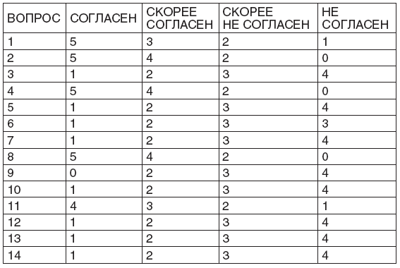 Тест состоит из двух частей. В первой из них вы должны ответить на 14 вопросов, распределяя ответы по 4 категориям: согласен, скорее согласен, скорее не согласен и не согласен.