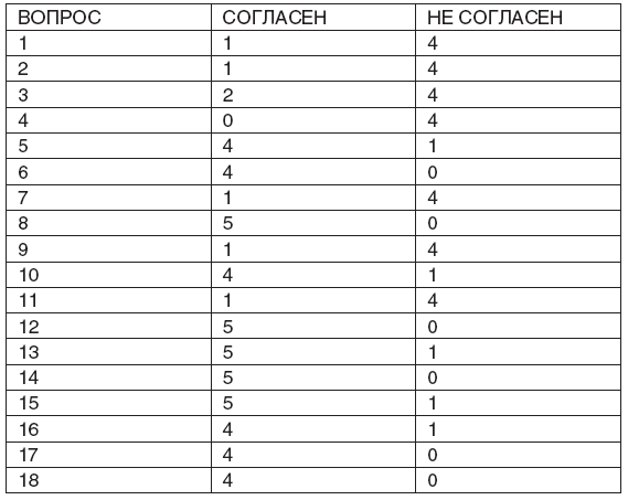 Вторая группа вопросов состоит из 18 вопросов, и тут на каждый вопрос надо отвечать только «согласен» или «не согласен».