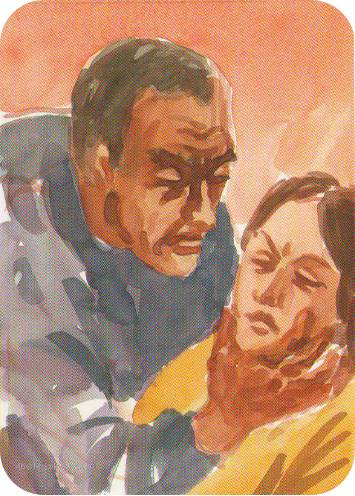 Н сначала с недоверием посмотрел на задание, и задумался над тем, как картинка поможет ему определиться с темой. Но все же, решил взять ежедневник с ручкой и записать свои ответы. Мужчина увидел на карте женщину или молодого парня, которого сжали в тиски. Он напуган и не может пошевелиться. Н представил себя этим человеком. Тем, кто боится дать отпор. С некоторыми он сам вел себя резко, чтобы не показывать слабость. С другими был тревожным, будто котенок, который мечтает спрятаться под дерево. Мужчина еще раз посмотрел на карту и обратил внимание на красно-коричневый фон, за которым неизвестность и опустошенность. Мужчина на картинке злится, что не получает должного внимания от жены. Второй персонаж не знает что делать. Он терпит и ждет, когда его оставят в покое.