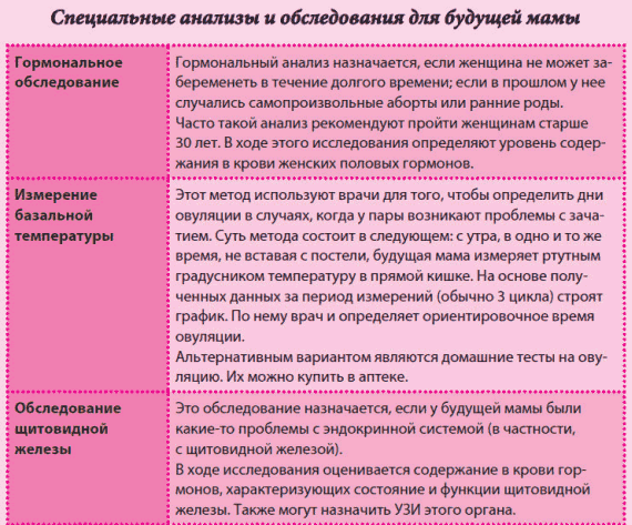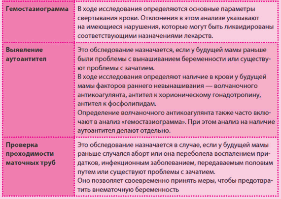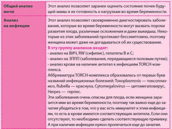 Обследования, которые он назначит, важно провести до наступления беременности, т. к. обострения ранее скрытой инфекции или хронического заболевания во время беременности могут нанести большой вред и матери, и ребенку. Помимо этого могут возникнуть сложности с лечением, т. к. многие препараты противопоказаны во время беременности. Поэтому обнаруженные заболевания, если это возможно, должны быть вылечены до наступления беременности.