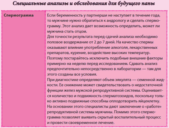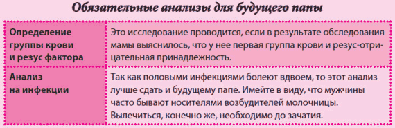Существует список рекомендуемых обследований. Они делятся на две группы: обязательные и специальные – анализы, которые назначают будущим родителям при определенных обстоятельствах (зрелый возраст родителей, риск возникновения пороков развития и т. п.). Специальные анализы и обследования назначаются врачом для того, чтобы иметь более полное представление о состоянии вашего здоровья. Если у будущих родителей есть какие-то хронические заболевания, то потребуется консультация соответствующего специалиста. Он может назначить дополнительные обследования, которые не названы в настоящем разделе.