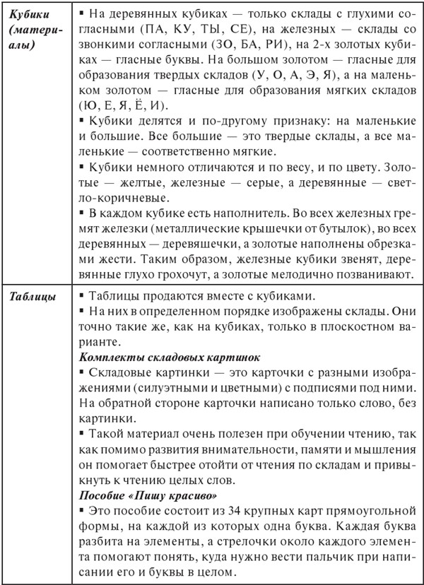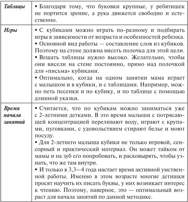 • Если учить кроху чтению и письму по этим чудесным кубикам, он не узнает, что такое слабое зрение и плохая осанка. Дело в том, что в комплект входят не только кубики, но и специальные таблицы, которые вешаются высоко, на уровне лица взрослого человека, поэтому всем деткам в группе хорошо видно все то, что на них изображено.