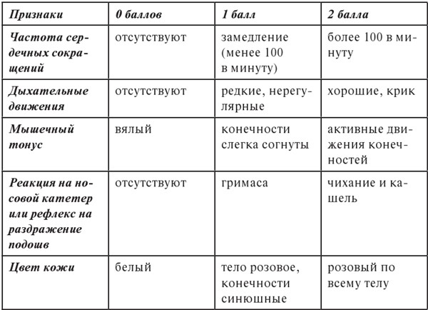 • Состояние новорожденного врач-неонатолог оценивает по 5 показателям: дыханию, сердцебиению, мышечному тонусу, рефлексам и цвету кожных покровов.