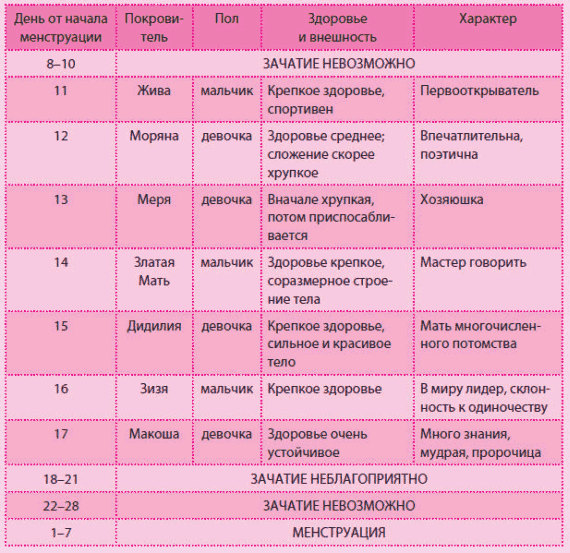 В наше время выполнить эти рекомендации непросто из-за того, что в современном мире нерегулярность менструаций является скорее правилом, чем исключением. Поэтому прежде всего необходимо стабилизировать свое душевное состояние, чтобы ваш организм вошел в постоянный ритм. И только после этого можно полагаться на вычисления. Давайте посмотрим, что сегодня известно науке о механизме зачатия. Раз в месяц в течение 10–4 дней в матке женщины созревает яйцеклетка. Обволакивающий ее пузырек лопается, и яйце клетка выходит прямо в воронку находящегося перед яичником яйцевода. Этот процесс называется овуляцией. Затем яйцеклетка постепенно продвигается по яйцеводу, где она может быть оплодотворена сперматозоидом. На весь путь уходит примерно 3– дня. Таким образом, время возможного зачатия распространяется на период с 10 до 18-го дня, считая от момента начала менструации. Женская яйцеклетка всегда содержит одну Х-хромосому. Сперматозоиды несут в себе либо такую же Х-хромосому, либо – Y-хромосому. При соединении с яйцеклеткой (собственно зачатие) получается сочетание хромосом либо ХХ, либо ХY. В первом варианте родится девочка, а сочетание ХY приведет к развитию из оплодотворенной яйцеклетки мальчика. Если в течение 48 часов после овуляции яйцеклетка не будет оплодотворена сперматозоидом, она разрушается и погибает. Начиная с третьего дня после овуляции и до начала так называемых «критических дней», когда вместе с менструальной кровью очищается место для новой яйцеклетки, женщина естественным образом защищена от зачатия. Весь процесс в целом длится примерно месяц и затем снова повторяется. Поэтому принято говорить о «месячном цикле». Его продолжительность в среднем 28 дней. Почти столько же времени длится лунный месяц. Эзотерики усматривают в этом совпадении закономерность. Считается, что зачатие ребенка и роды находятся под покровительством ночного светила.