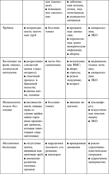 О женском бесплодии говорят, если причиной бесплодного брака являются те или иные нарушения в организме женщины, о мужском – когда женщина здорова, а у мужчины наблюдается резкое снижение оплодотворяющей способности спермы. При сочетании женского и мужского бесплодия говорят о комбинированной форме бесплодия. В случае, когда у обоих супругов нормальные показатели репродуктивной функции, однако специальные пробы указывают на их несовместимость, последняя рассматривается как особая форма бесплодного брака, которая требует специального подхода при определении тактики лечения. Кроме того, бесплодие может встречаться и среди совершенно здоровых и хорошо совместимых супружеских пар. В таком случае даже полное обследование не позволяет определить его причину. Тогда ставится диагноз бесплодия неясного происхождения.