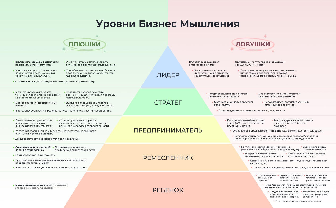 В пирамиде собран и систематизирован огромный массив знаний. Она учитывает все основные “твердые” инструменты, которые нужны для развития бизнеса, построена на бизнес-психологии, знаниях о работе мозга и спиральной динамике. Это квинтэссенция моего личного опыта и глубоких знаний, которые я собирала много лет.