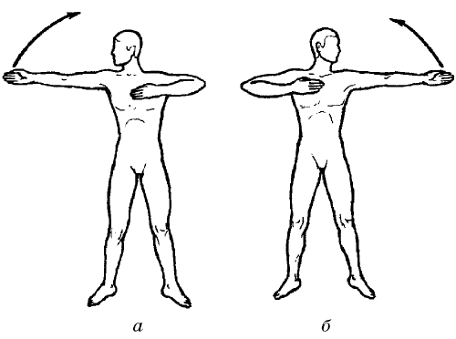 И. п.: стоя, ступни расставлены примерно на 30 см, правая рука вытянута горизонтально в сторону, а левая согнута у груди, при этом указательный и большой пальцы касаются правой ключицы (рис. 2, а).