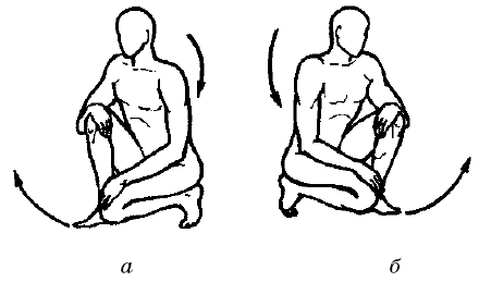 Поверните туловище вправо, положив левое колено на пол возле правой ступни, ладони при этом остаются на коленях (рис. 5, а).