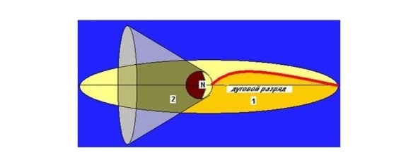 Контур гиперболы возникает в любом случае, поскольку, вращающийся луч ядра световой проекции, от дугового разряда пересекается с конусом тени, освещенного тела светом вспышки из области взрыва. Комбинации построения моделей могут быть иными. Из приведенного устройства, на мой взгляд, логично вероятное допущение, учитывающее симметричность левой и правой части проекции конусов.