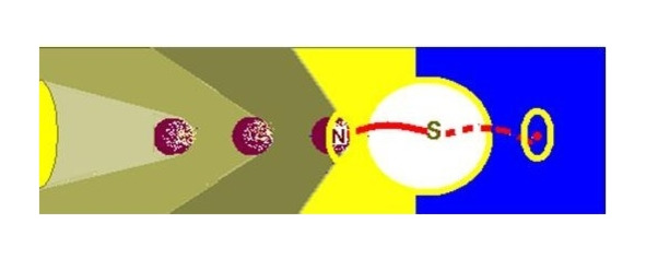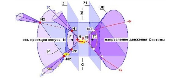 Ось проекции конуса в момент дугового разряда в ближнем положении вершины перигелия гиперболы, находится на одной линии с объектами N и S и совпадает с направлением движения солнечной системы. Рис. 3