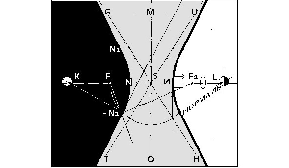 Вместе с тем фокальные объекты масштаба спутников в мнимом пространстве плавя космическую пыль, различного калибра фракцию веществ, превращаются в действительные, материальные объекты. Точка, —N1, движения вдоль касательной на гиперболе взята произвольно, при отскоке звездного ядра она задает конфигурацию, раствора угла раскрытия GNT ветви гиперболы. Проходя через вершину гиперболы в точке N, пересекая действительную ось KL, производит -уговой разряд плазмы в область S.