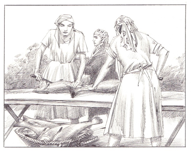 Now Mama, now Valya, and sometimes both of them together hit their knives with hammers, cutting through the sturdy fish spines, slicing the fish into chunks.