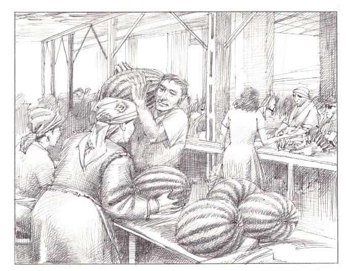 “So, did he bring it?” Grandma asked again, informing the inhabitants of our yard about the situation in the family. “Go to the bazaar and buy a chicken leg and rice for Amnun. Cook broth for him. Also buy a flatbread and a big tomato, this big,” and she spread the fingers of her right hand for fear that Mama might buy a not-big-enough tomato.
