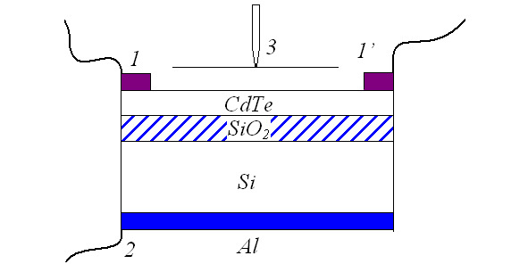 Polycrystalline (grain sizes are 0.05—0.1 microns) CdTe films were obtained on the surface of SiO2 – Si. CdTe and Ag and Cu impurities evaporated in a vacuum of 10—5 mmHg from separate evaporators onto the heated oxidized surface of Si. The relative arrangement of the layers of the CdTe – SiO2 – Si structure and the ohmic contacts to them is schematically shown in Fig.1. In such a structure, photosensitivity is controlled by external influences, such as an electric field or corona discharge, which change the built-in field in the dielectric. In this case, we have a “reverse” field – effect transistor of the CdTe – SiO2 – Si type, when the control charge is located under the semiconductor layer, and its surface remains open.