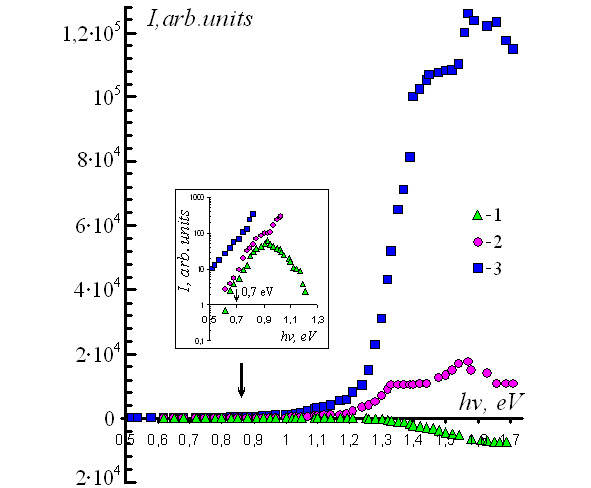 Fig.2. Spectral dependences of the Icz for the CdTe-SiO2-Si structure on the magnitude of the corona discharge potential: jcr = 0 V (curve 1), 40 V (2),70 V (3). The inset shows the photosensitivity spectra of the impurity region of light absorption on a logarithmic scale.