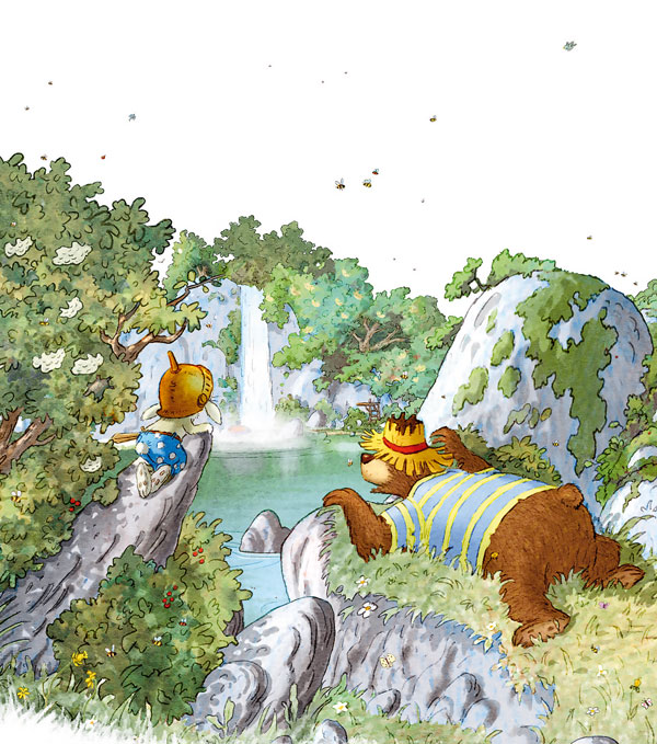 В Волшебном лесу наступило дивное летнее утро. Заяц и его друг Медведь уже давно проснулись и шагали к пруду, чтобы поплавать. Жужжали пчёлы, щебетали птички, порхали наперегонки разноцветные бабочки и стрекотали кузнечики. Весь мир наполняли чудесные звуки лета.