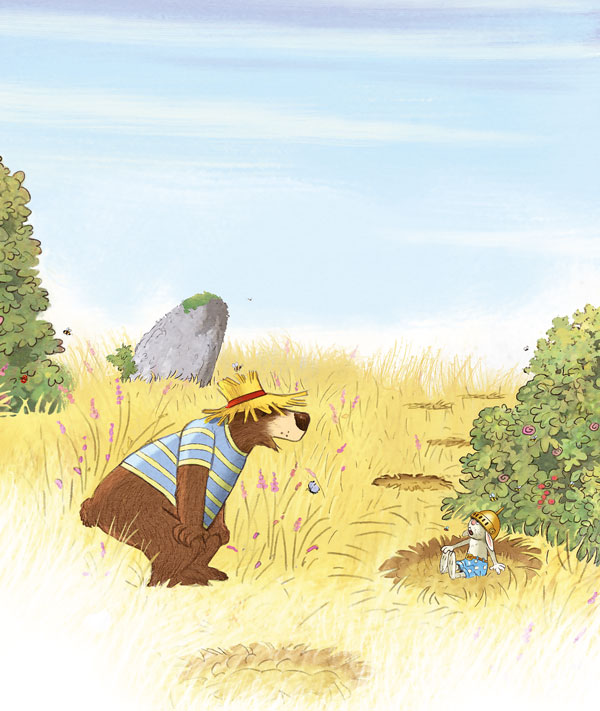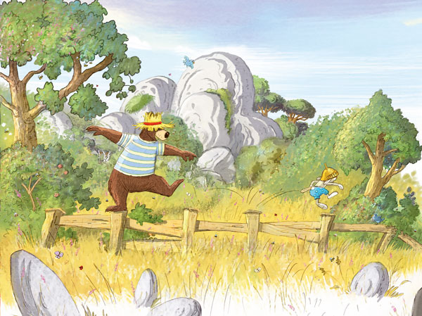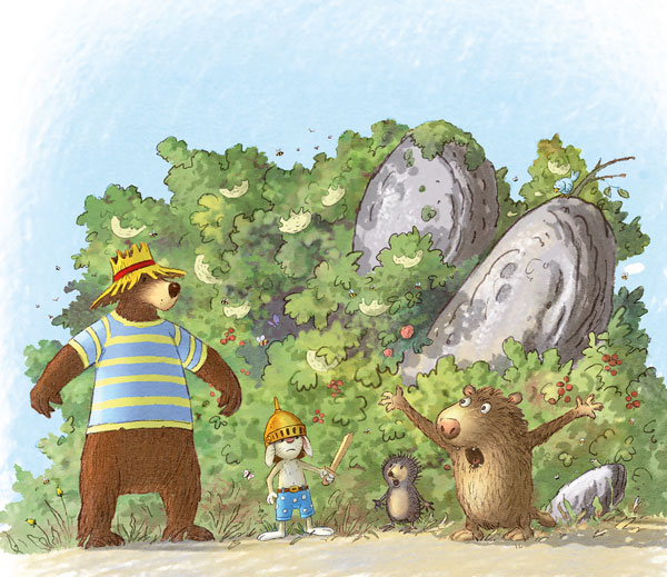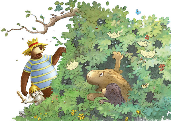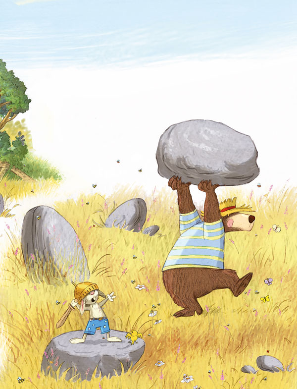У друзей было прекрасное настроение. Иногда они останавливались, чтобы поупражняться: Заяц тренировался со своим деревянным мечом, а Медведь поднимал тяжёлые камни. Передохнув, они снова отправлялись в путь.