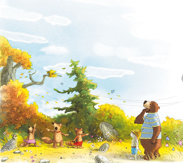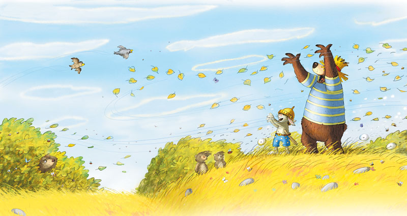Этот день в Волшебном лесу выдался довольно ветреным. Медведь и Заяц стояли рядом друг с другом на пригорке, увлечённые вновь придуманной игрой. Они подбрасывали в воздух всё, что им попадалось, – листочки, травинки, веточки – и смотрели, как ветер уносит их.