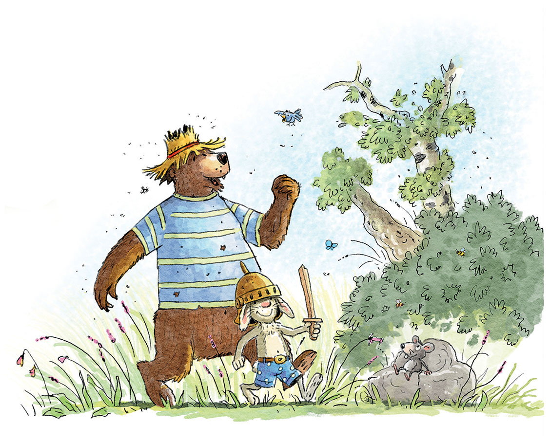 А тем временем Заяц и Медведь дружно шагали по душистой траве, насвистывая весёлую песенку. Серый Мышонок, одиноко сидевший на камешке, решил присоединиться к ним.