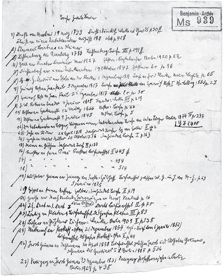 С. 9. Рукопись В. Беньямина. 1931. Список из 31 письма, 13 из которых были опубликованы в газете «Франкфуртер Цайтунг» с апреля 1931-го по май 1932 года