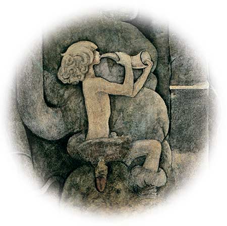 Клампе-Лампе вырыл большую землянку под семью высокими соснами. И было у него там так тепло и уютно, что он обычно сидел сиднем дома и следил за очагом, огонь в котором горел, не затухая, уже тысячу лет.