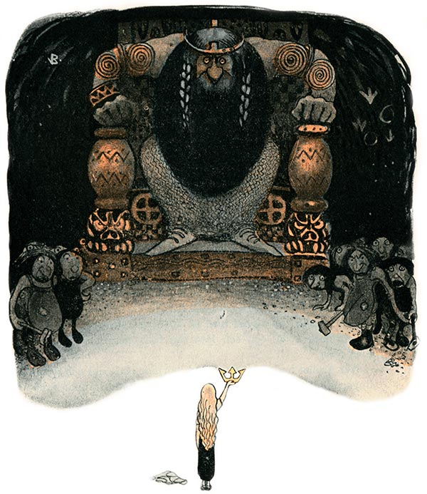 – Тебе ведь известно, – сказали они, – что нашего доброго старого короля больше нет. Нам нужен новый, чтобы правил большими и маленькими троллями, гномами и эльфами. Почётное место в Семимильной горе ждёт нового короля. Но мы никак не можем решить, кого выбрать. И вот просим тебя дать нам совет: кому быть королём троллей и хозяином Семимильной горы?