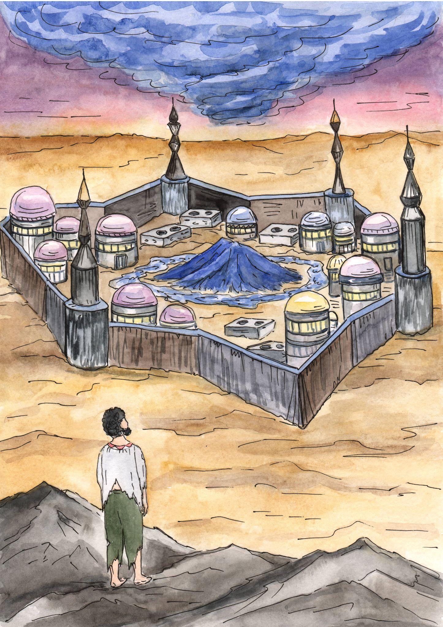Под конец седьмого дня он забрался на гору и увидел огромную синюю тучу. Она зависла над пустынным городом, который окружала неприступная каменная стена. В середине города вокруг высокой кучи синего песка текла река. Текла сама и по кругу.