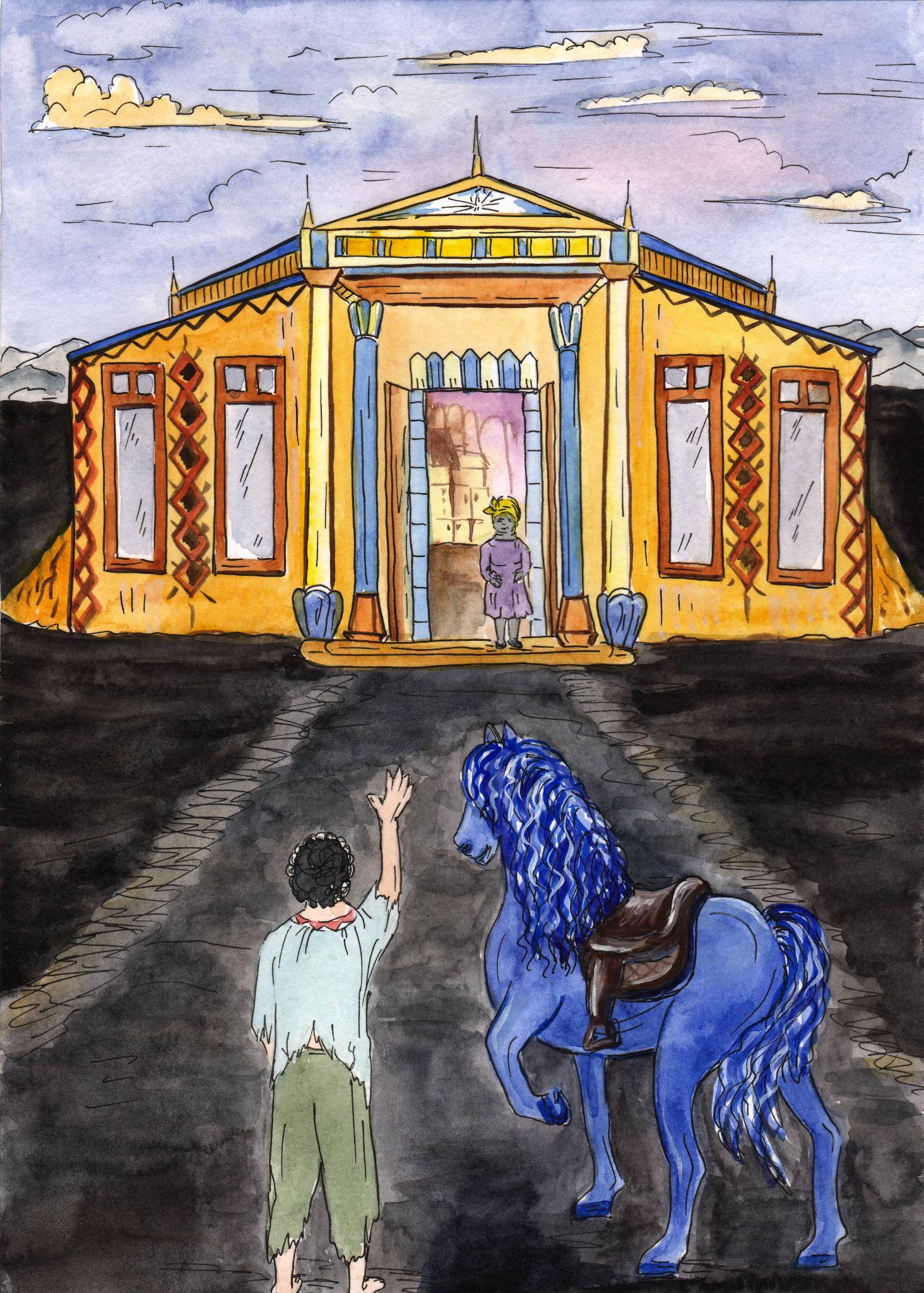 Только договорил царь, и сразу стражники Чарагима под руки взяли да потащили к выходу из дворца. Из ворот выставили и отдали сундук. Чарагим и бороться не стал. Сундук в кафтанчик завернул да побежал на базар. К тому самому торговцу, которому отдал синего коня.
