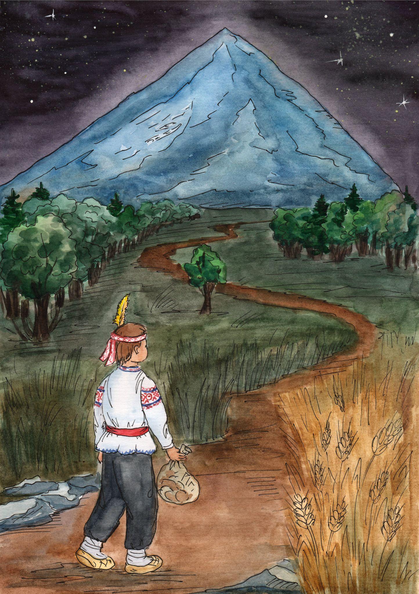 Уже в первый день своего пути мальчик добрался к подножию. Встретил его дремучий синий лес.