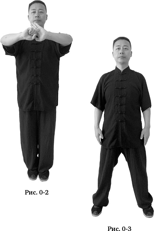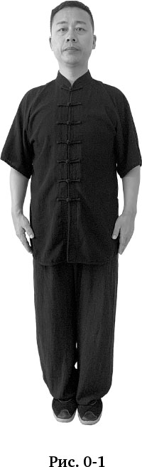Встать в центре выбранного вами места для занятия лицом на юг[1]. Стопы вместе, тело ровное, макушка тянется вверх, руки опущены вниз по бокам, ладони касаются бёдер. Плечи расслаблены, дыхание естественное (рис. 0–1).